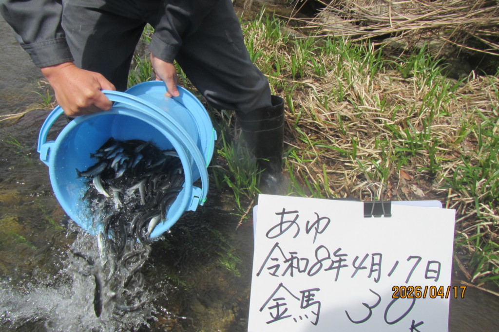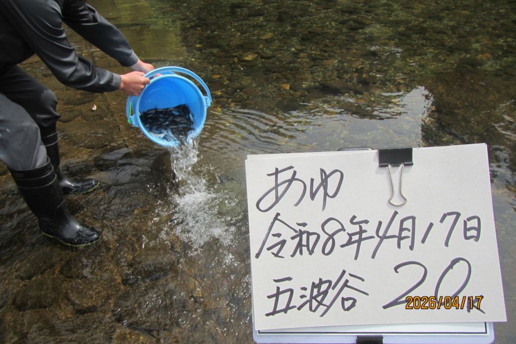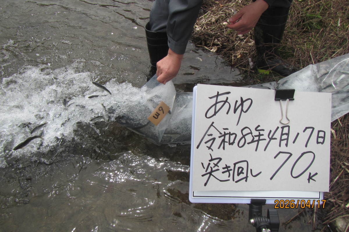 17Apr2026 稚鮎放流170k 鮎解禁に向けて、今シーズン5回目の稚鮎放流を行いました。 五波谷~黒田大橋下流、稚鮎170kを放流しました。 生憎の天気でしたが、無事に放流できました。 次回は、4/21を予定しています。 稚鮎放流170k 水況:平屋大橋 最近のお知らせ一覧お知らせ一覧 水況:平屋大橋 2026.04.20 稚鮎放流170k 2026.04.15 稚鮎放流170k 2026.04.14 水況:平屋大橋 2026.04.13 水況:平屋大橋 2026.04.10
