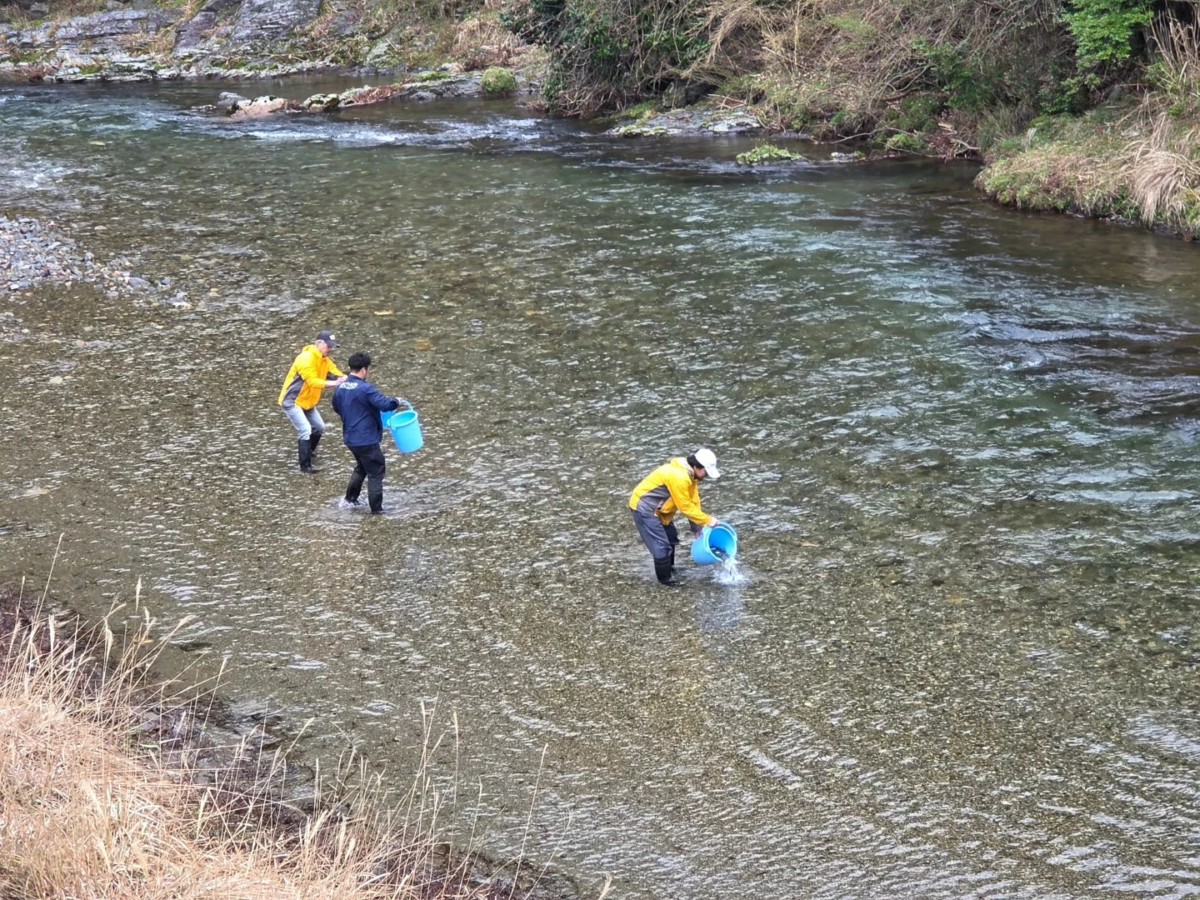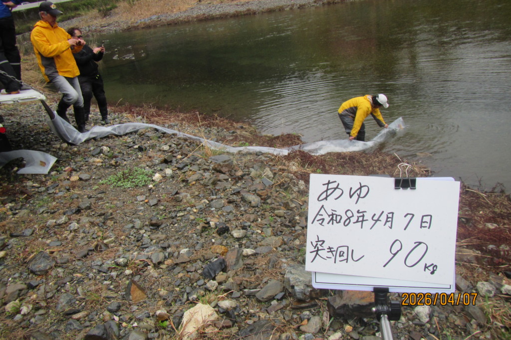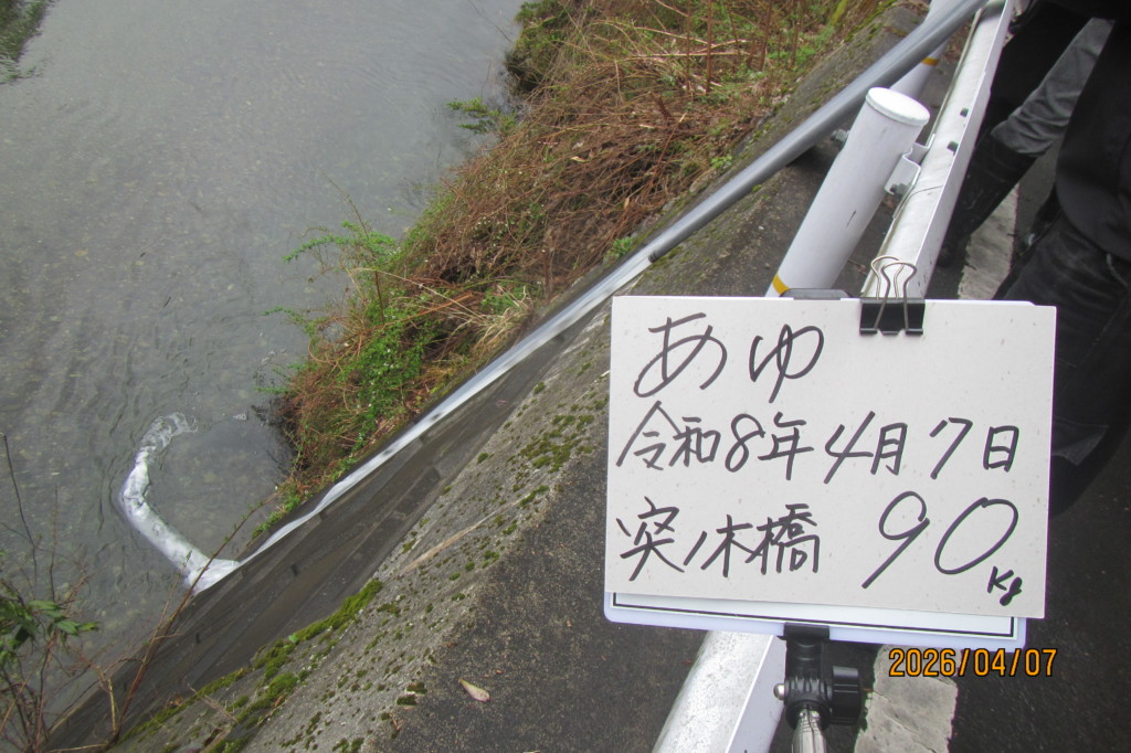 07Apr2026 稚鮎放流180k 鮎解禁に向けて、いよいよ本日から稚鮎放流が始まりました。 本日午前中、稚鮎180kを放流しました。(田歌祗園橋~黒田橋下流) 次回は、明日4/8を予定しています。 水況:平屋大橋 最近のお知らせ一覧お知らせ一覧 水況:平屋大橋 2026.04.06 水況:平屋大橋 2026.04.01 水況:平屋大橋 2026.03.30 あまご追加放流150k 2026.03.29 水況:平屋大橋 2026.03.27