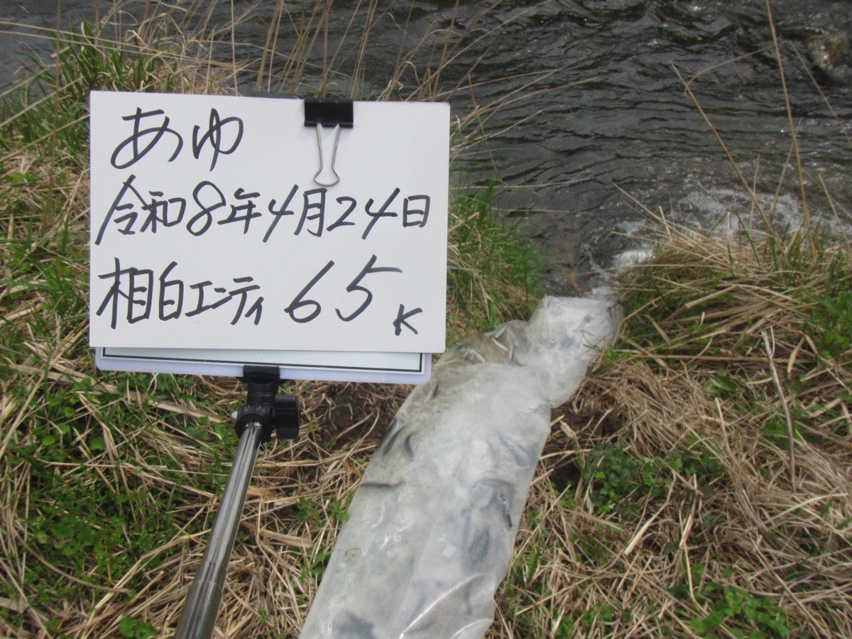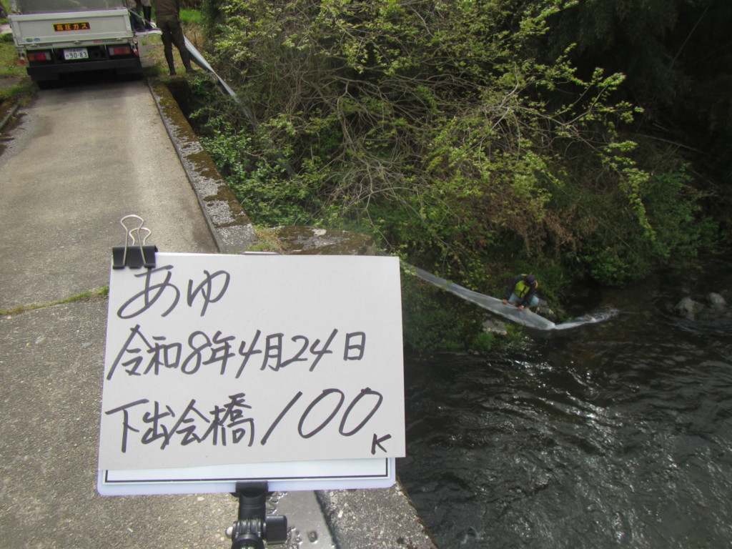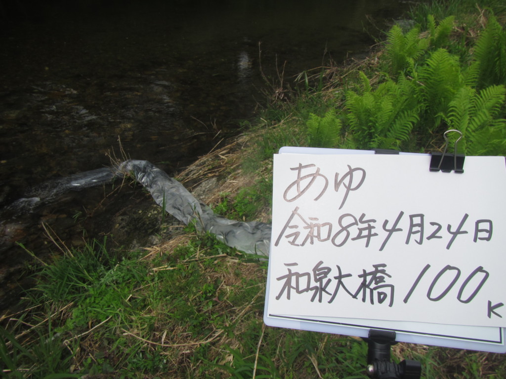 24Apr2026 稚鮎放流400k 鮎解禁に向けて、今シーズン8回目の稚鮎放流を行いました。 支流棚野川へ初めての放流、200kを放流しました。 本流下流部の、和泉大橋へ100k、下出会い橋へ100kを放流しました。 次回は、未定です。 稚鮎放流170k 最近のお知らせ一覧お知らせ一覧 稚鮎放流170k 2026.04.22 稚鮎放流170k 2026.04.21 水況:平屋大橋 2026.04.20 稚鮎放流170k 2026.04.17 稚鮎放流170k 2026.04.15