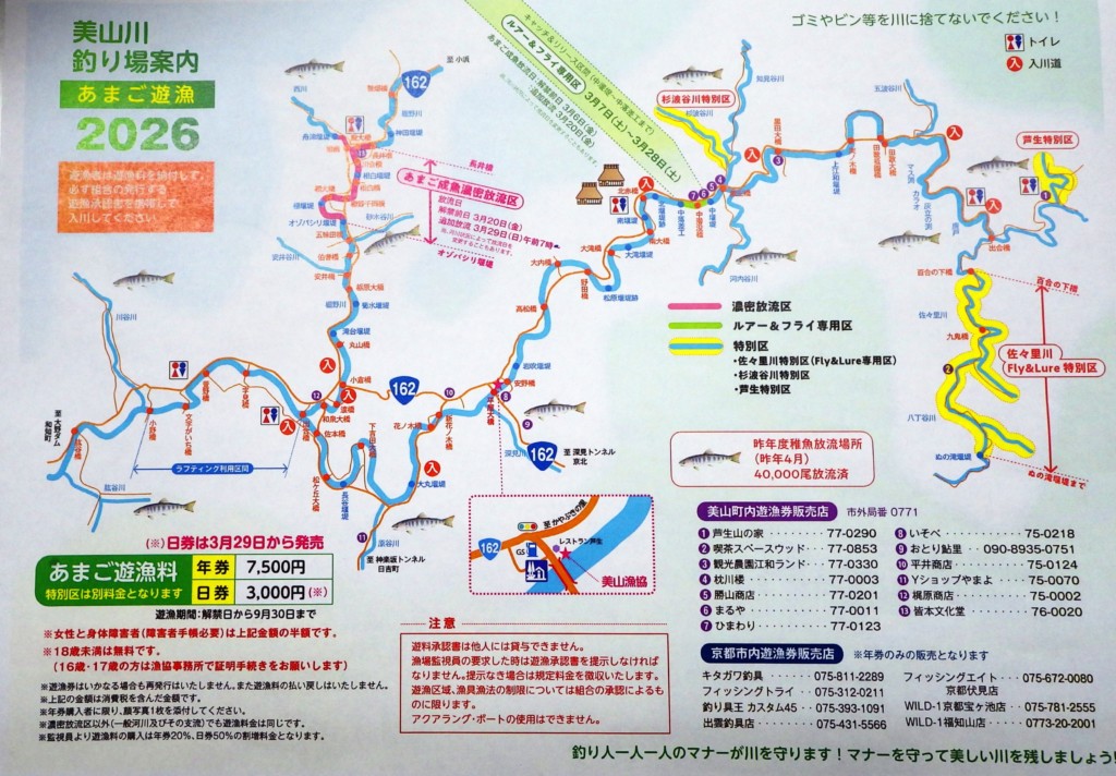 釣り場案内 2025年度 鮎リーフレット 2025年度の鮎稚魚放流は、計3,000k(湖産種苗)予定です。2025年度 鮎放流情報 2026年度 あまごリーフレット 2025年4月にあまご稚魚放流 40,000尾放流済2026年度の成魚放流は700kを予定しています。 ①3/6 100k(ルアー&フライ専用区)、 ②3/20 400k(濃密放流区、原、知見、川谷川) 50k(ルアー&フライ専用区) ③3/29 150k(濃密放流区のみ)